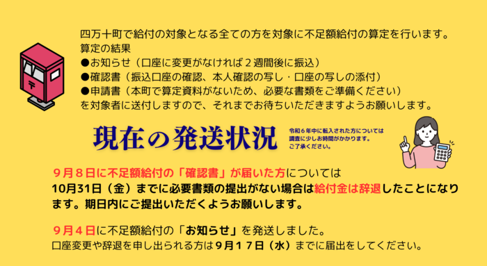 昨年、夏ごろから実施した当初調整給付金はなるべく早期に給付を実施する観点から所得税分については四万十町で把握している令和5年分の所得状況などの情報に基づき、支給額を算定しました。そのため、令和6年分所得税実績額などが確定した結果、当初調整給付金の支給額に不足が生じた人に不足額給付を実施するものです。